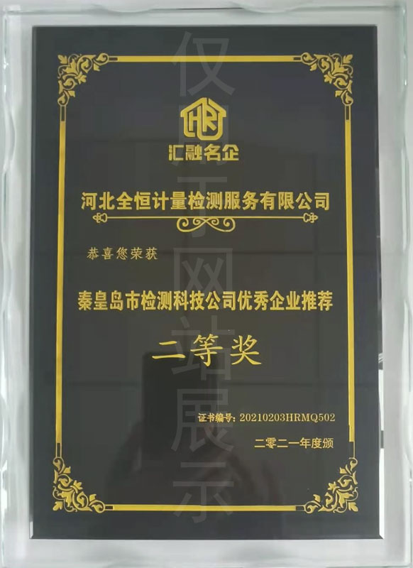 秦皇島市檢測(cè)科技有限公司優(yōu)秀企業(yè)推薦二等獎(jiǎng)銘牌